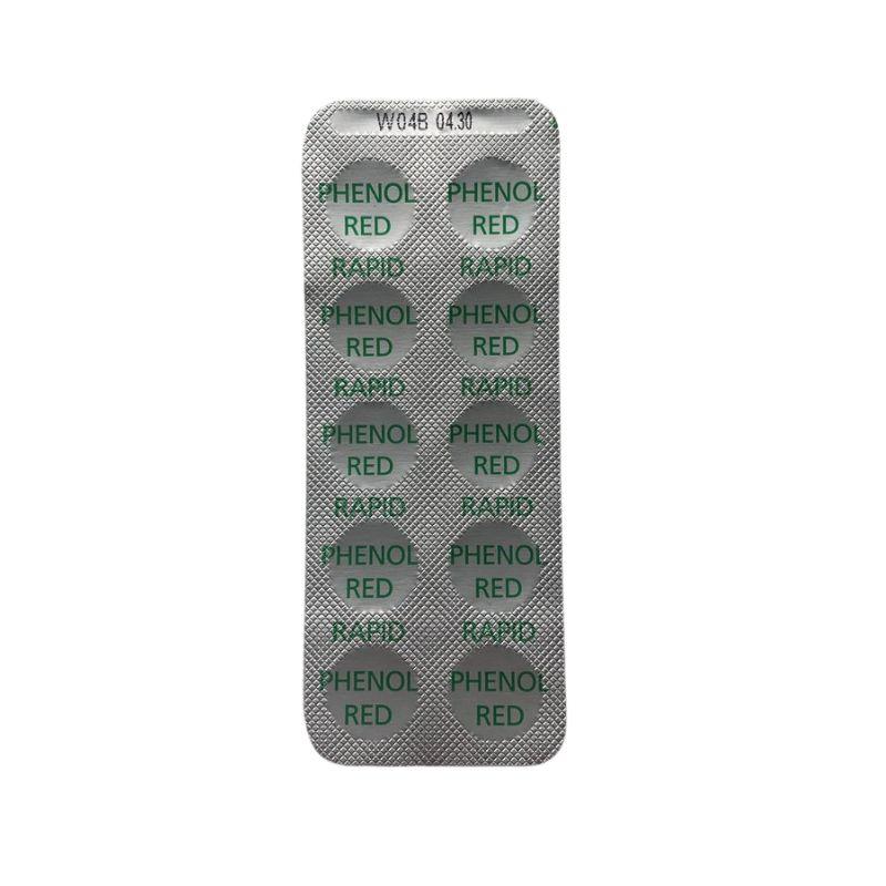 Καρτέλα αλουμινίου που περιέχει 10 δισκία phenol red για τη μέτρηση του PH, κατάλληλα για χρήση με τη βοήθεια των ανάλογων τεστ ελέγχου.