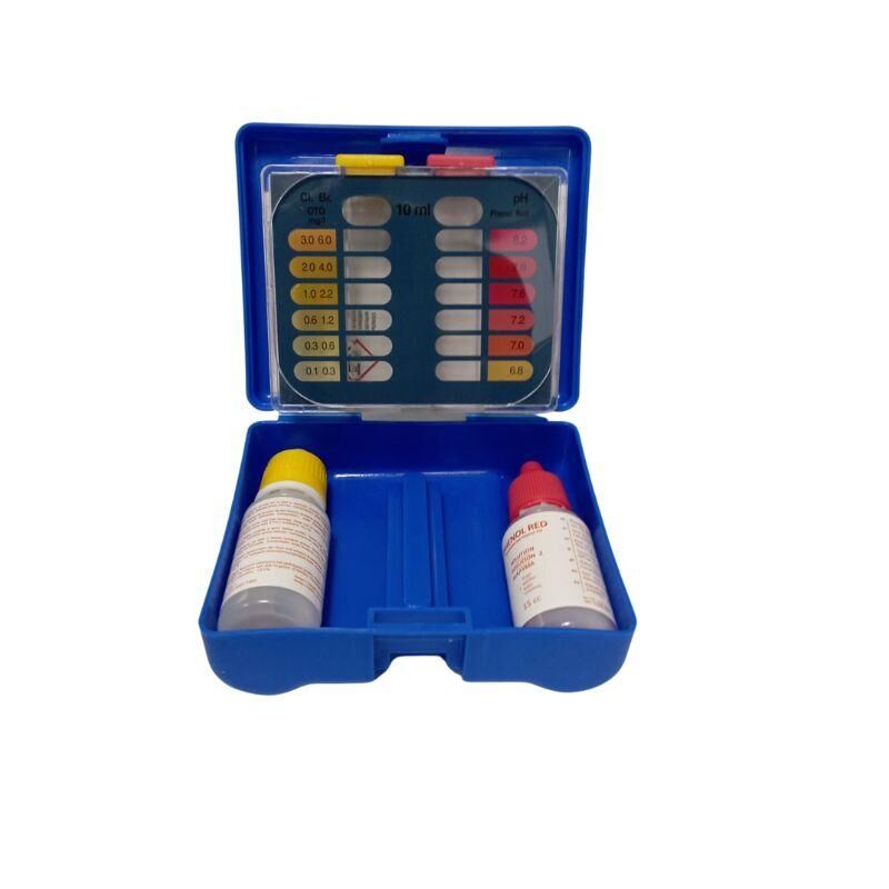 Τεστ μέτρησης της παρουσίας Ολικού χλωρίου/ ΡΗ / Βρωμίου στο νερό της πισίνας. Η μέτρηση των χαρακτηριστικών αυτών γίνεται με τη βοήθεια των ενσωματωμένων διαλυμάτων ΟΤΟ και phenol red.